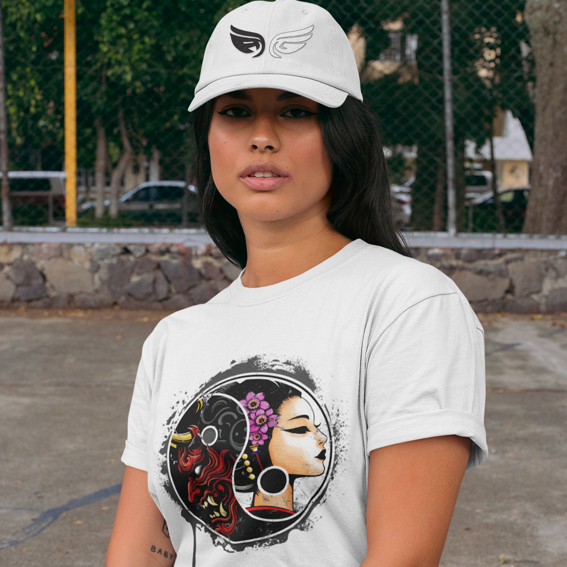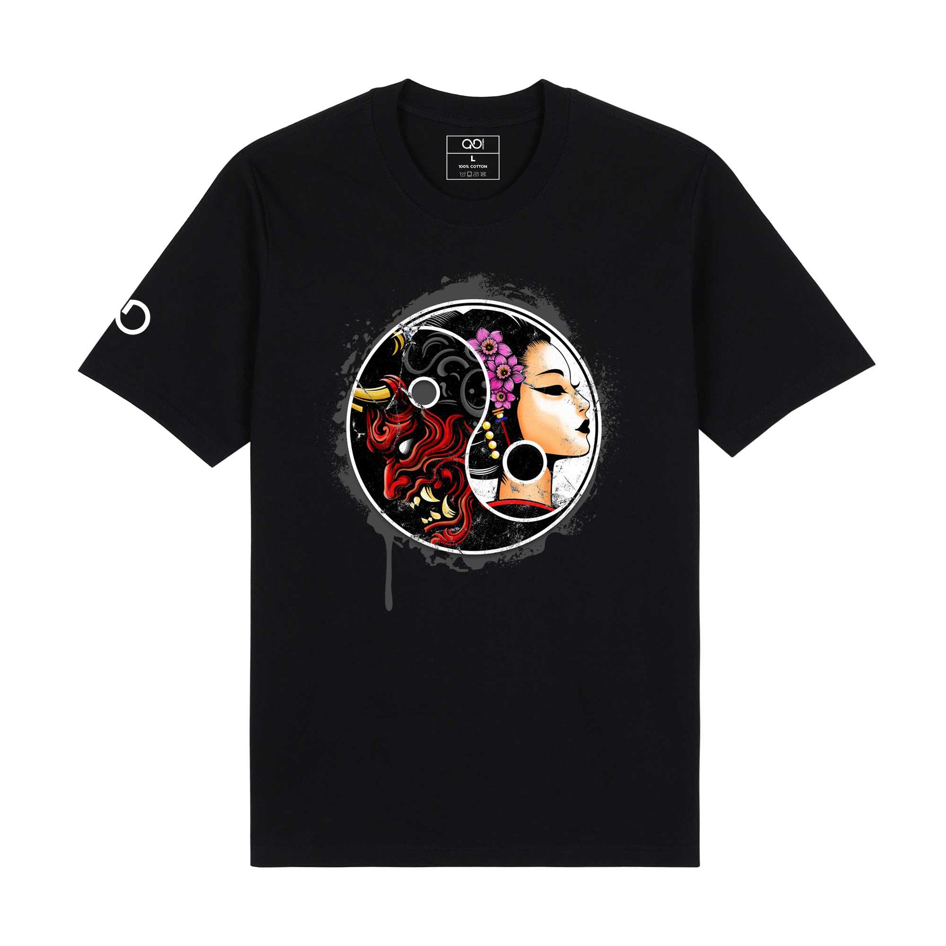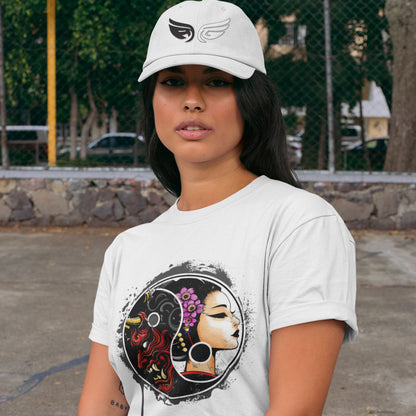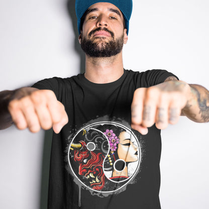 Capture the harmony of contrasts with this striking Hannya Mask Geisha Yin Yang T-Shirt! This unique design features Hannya mask (onyo), symbolizing intensity and passion - Geisha (yin), representing elegance and serenity side by side, embodying balance and unity between light and darkness